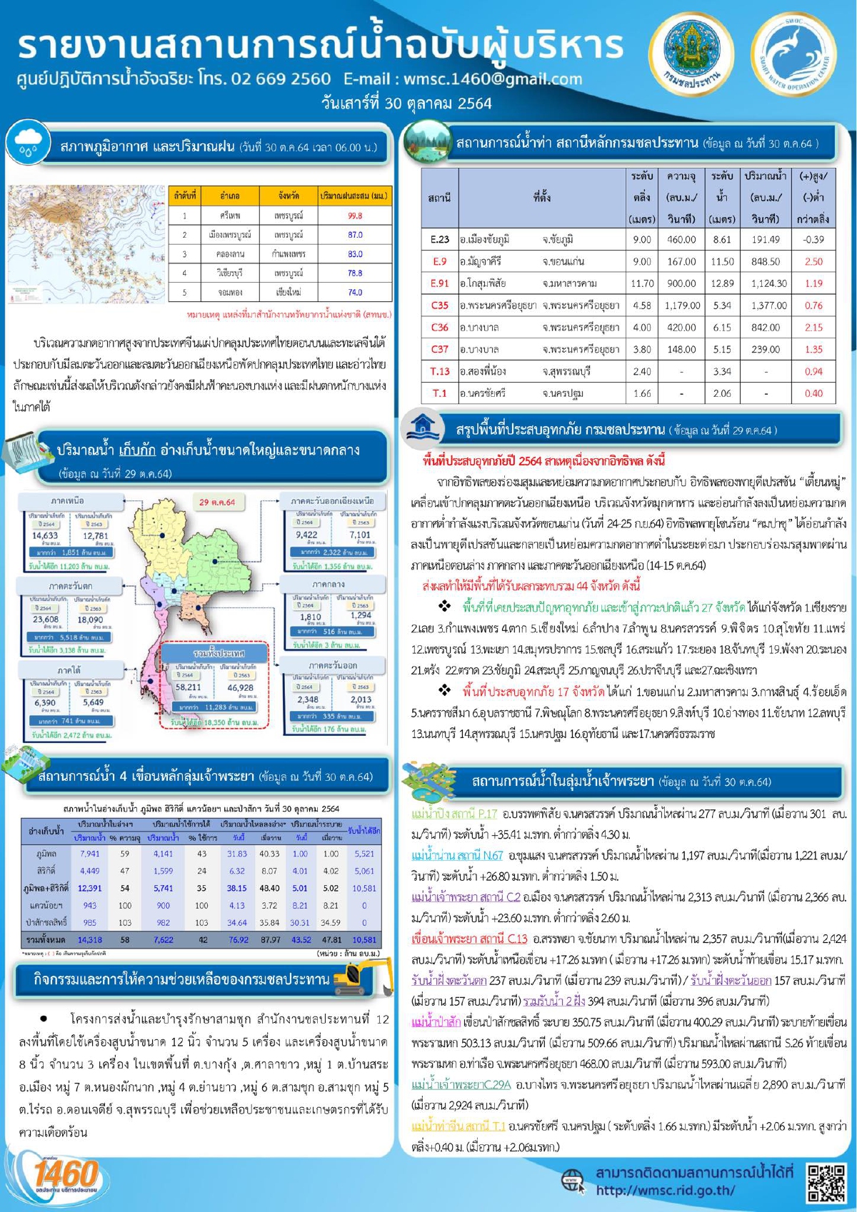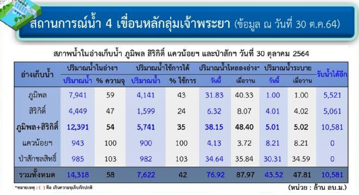 ขณะที่ สถานการณ์น้ำในลุ่มน้ำเจ้าพระยา (ข้อมูล ณ วันที่ 30 ตุลาคม 2564) รายละเอียดมีดังนี้