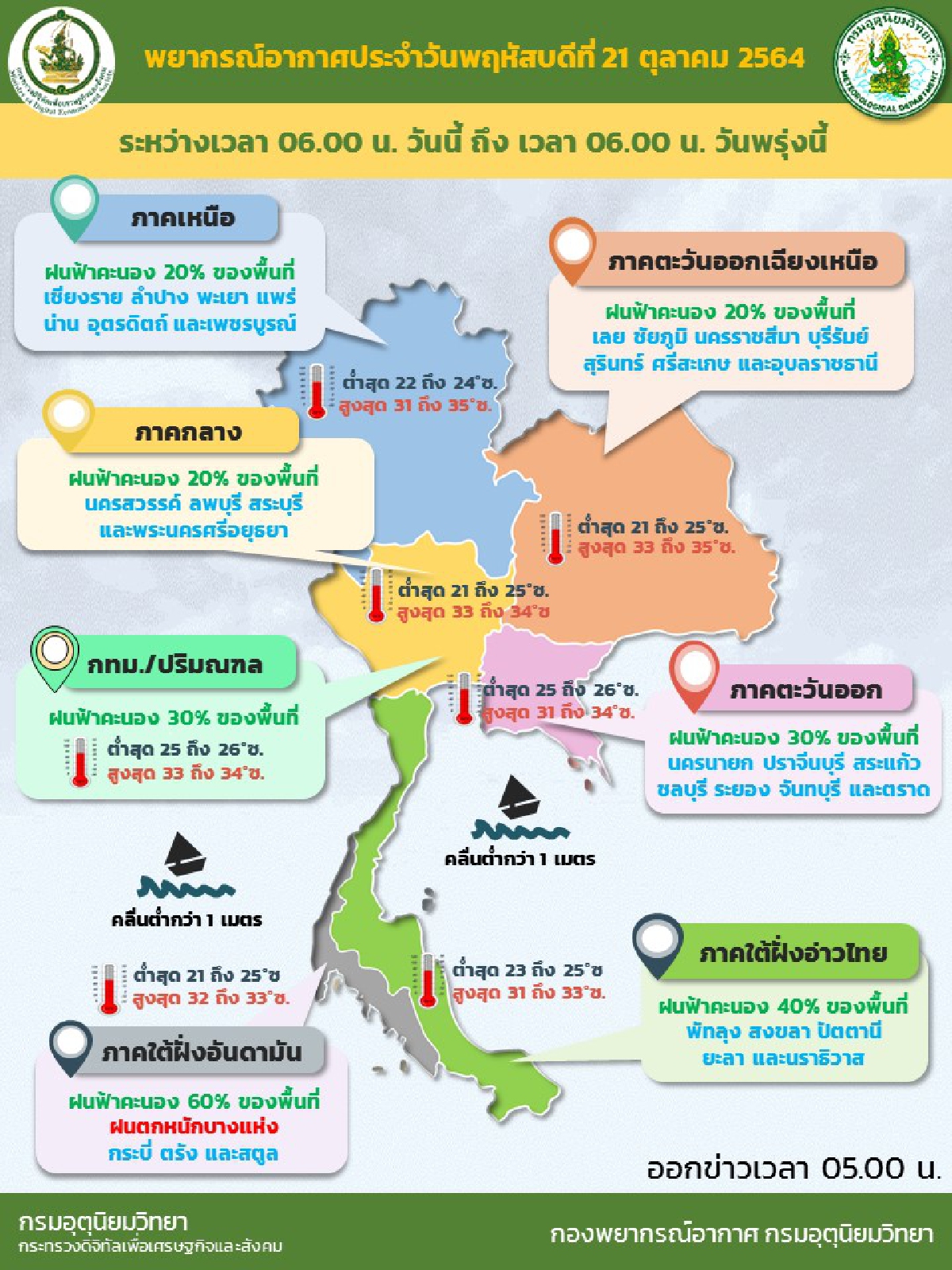 (21 ต.ค.2564) กรมอุตุนิยมวิทยา พยากรณ์อากาศ 24 ชั่วโมงข้างหน้า มีลมตะวันออกและลมตะวันออกเฉียงใต้พัดปกคลุมประเทศไทยตอนบน อ่าวไทย ภาคใต้ และทะเลอันดามัน ลักษณะเช่นนี้ทำให้ประเทศไทยตอนบนยังคงมีฝนน้อย ส่วนภาคใต้มีฝนฟ้าคะนองเกิดขึ้นกับมีฝนตกหนักบางแห่งในระยะนี้
