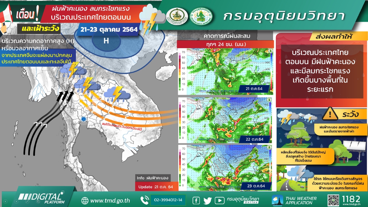 ทำให้ในช่วงวันที่ 21 – 23 ต.ค.2564 บริเวณประเทศไทยตอนบนมีฝนฟ้าคะนองและลมกระโชกเกิดขึ้นในระยะแรก หลังจากนั้นฝนจะลดน้อยลง ในขณะที่ร่องมรสุมพาดผ่านบริเวณภาคใต้ตอนกลาง ทำให้ภาคใต้ยังคงมีฝนตกต่อเนื่องและมีฝนตกหนักบางแห่ง ขอให้ประชาชนบริเวณประเทศไทยตอนบนระมัดระวังอันตรายจากฝนฟ้าคะนองและลมกระโชกที่จะเกิดขึ้นในระยะนี้ไว้ด้วย