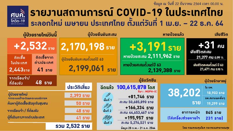 22 ธันวาคม 2564 ที่ทำเนียบรัฐบาล พญ.สุมนี วัชรสินธุ์ ผู้อำนวยการสำนักสื่อสารความเสี่ยงและพัฒนาพฤติกรรมสุขภาพ กรมควบคุมโรค ในฐานะผู้ช่วยโฆษกศูนย์บริหารสถานการณ์การแพร่ระบาดของโรคติดเชื้อไวรัสโคโรนา 2019 (โควิด-19) หรือ ศบค. แถลงสถานการณ์ในประเทศไทย ว่า สถานการณ์ผู้ติดเชื้อโควิด-19 ภายในประเทศวันนี้ มีรายงานติดเชื้อรายใหม่ 2,532 ราย ติดเชื้อภายในประเทศ 2,443 ราย จากระบบเฝ้าระวังและบริการ 2,393 ราย ค้นหาเชิงรุกในชุมชน 50 ราย ติดเชื้อในเรือนจำ 48 ราย จากต่างประเทศ 41 ราย หายป่วยเพิ่มเติม 3,191 ราย อยู่ระหว่างการรักษา 38,202 ราย อาการหนัก 845 ราย ใส่เครื่องช่วยหายใจ 231ราย