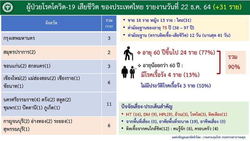 ทั้งนี้ มีผู้เสียชีวิตเพิ่มเติม 31 ราย เป็นชาย 18 ราย หญิง 13 ราย เป็นผู้มีอายุ 60 ปีขึ้นไป 24 ราย มีโรคเรื้อรัง 4 ราย เสียชีวิตมากที่สุดที่ จ.นครศรีธรรมราช 4 ราย ทำให้มีผู้ติดเชื้อสะสมตั้งตั้งปี 2563 ทั้งสิ้น 2,199,061 ราย หายป่วยสะสม 2,139,388 ราย เสียชีวิตสะสม 21,471 ราย ขณะที่สถานการณ์โลกมีผู้ติดเชื้อสะสม 276,589,282 ราย เสียชีวิตสะสม 5,385,004 ราย ยอดผู้ฉีดวัคซีนในประเทศเพิ่มเมื่อวันที่ 21 ธันวาคม 2564 จำนวน 444,037 โดส ทำให้มียอดสะสมตั้งแต่วันที่ 28 กุมภาพันธ์ 2564 ทั้งสิ้น 100,615,878 โดส