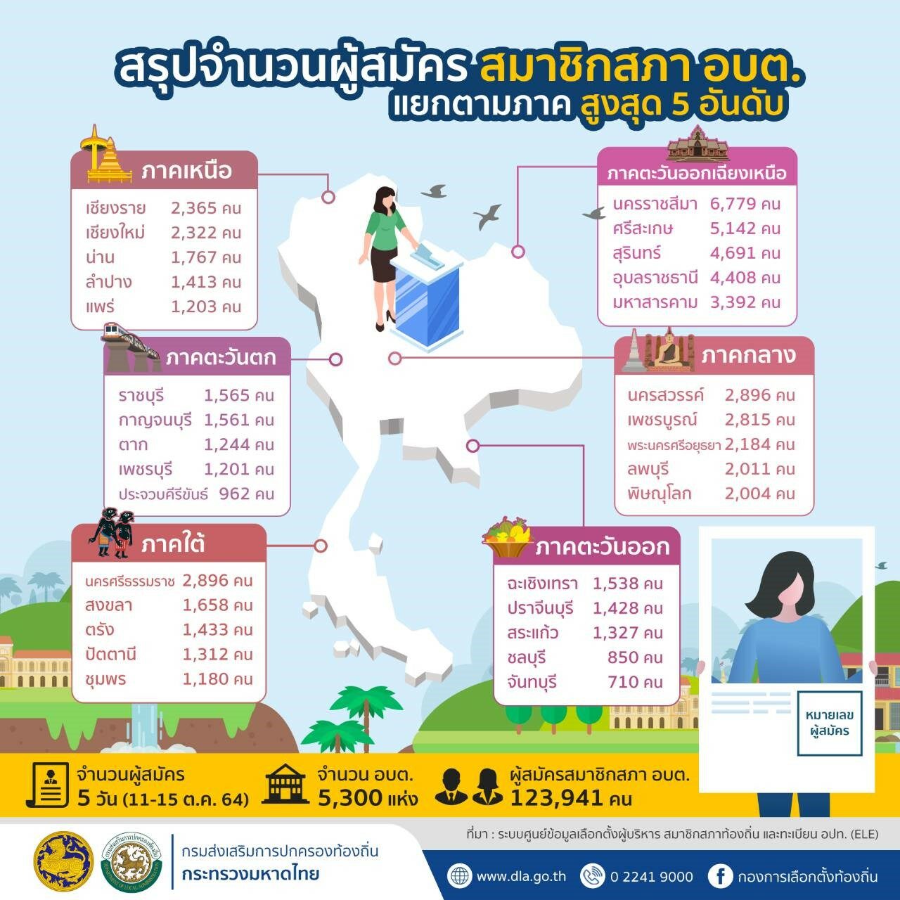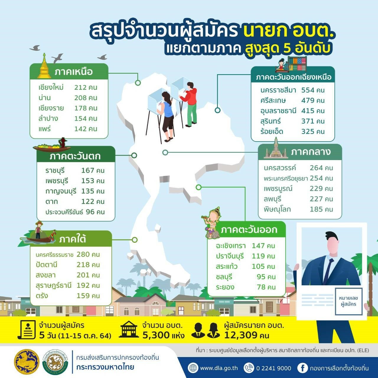 วันนี้ (10 พฤศจิกายน 2564) นายสุทธิพงษ์ จุลเจริญ ปลัดกระทรวงมหาดไทย เปิดเผยถึงการเลือกตั้งสมาชิกสภาองค์การบริหารส่วนตำบลและนายกองค์การบริหารส่วนตำบล ที่จะมีขึ้นในวันที่ 28 พฤศจิกายน 2564 ว่า จากที่คณะกรรมการการเลือกตั้ง (กกต.) ได้กำหนดเปิดรับสมัครเลือกตั้งนายกองค์การบริหารส่วนตำบล (นายก อบต.) และสมาชิกสภาองค์การบริหารส่วนตำบล ทั้ง 5,300 แห่งทั่วประเทศ โดยประกาศบัญชีรายชื่อผู้สมัครรับเลือกตั้งไปเมื่อวันที่ 22 ตุลาคม 2564 นั้น จากระบบศูนย์ข้อมูลเลือกตั้งฯ (ระบบ ele) สามารถสรุปภาพรวมของข้อมูลการรับสมัครรับเลือกตั้งนายกองค์การบริหารส่วนตำบลทั่วประเทศ ได้ว่า จำนวนองค์การบริหารส่วนตำบล (อบต.) ทั่วประเทศ จำนวน 5,300 แห่ง