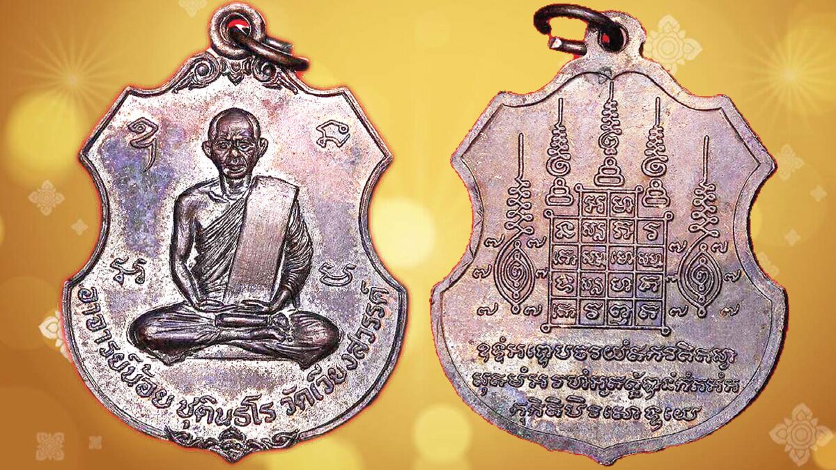 ลักษณะมีหูห่วง ด้านหน้าเหรียญ เป็นรูปเหมือนนั่งขัดสมาธิ ด้านข้างมีอักขระยันต์ มะอะอุ ใต้รูปเหมือนเขียนคำว่า อาจารย์น้อย ชุตินฺธโร วัดเวียงสวรรค์ ด้านหลังเหรียญ ประทับด้วยยันต์ครู 5 ยอด เป็นยันต์ประจำตัว นำหัวใจของยันต์โบราณต่างๆ มารวมอยู่ในตาราง ขนาบด้วยยันต์เฑาะว์ ด้านซ้าย-ขวา ล้อมรอบด้วยเลข ๗ ด้านล่างเหรียญลงคาถายอดมหาอุด ด้วยความที่มีประสบการณ์ ทำให้ได้รับขนานนามว่า “เสื้อเกราะเนินเวียง”