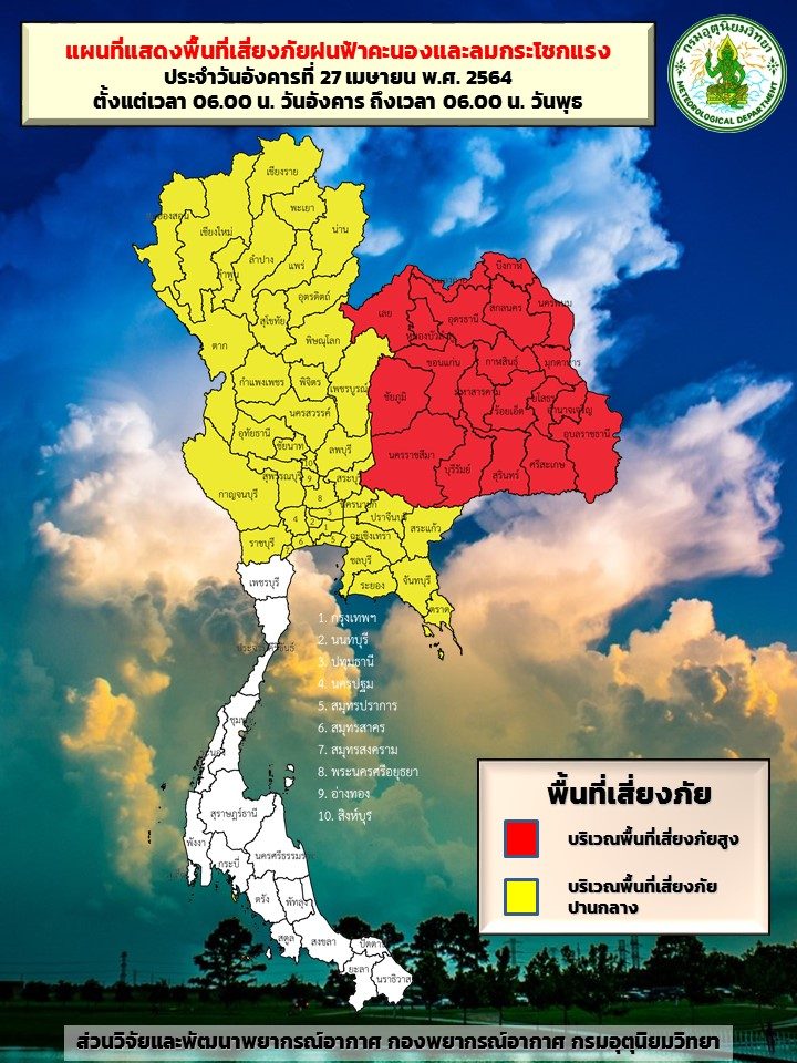 วันที่ 27 เมษายน กรมอุตุนิยมวิทยา พยากรณ์อากาศ 24 ชั่วโมงข้างหน้า บริเวณความกดอากาศสูงระลอกใหม่จากประเทศจีนได้แผ่ลงมาปกคลุมภาคตะวันออกเฉียงเหนือตอนบนของประเทศไทยและทะเลจีนใต้แล้ว ในขณะที่ประเทศไทยตอนบนมีอากาศร้อน ประกอบกับมีลมตะวันตกเฉียงใต้และลมตะวันออกเฉียงใต้พัดปกคลุมประเทศไทย ลักษณะเช่นนี้ทำให้ภาคเหนือ ภาคตะวันออกเฉียงเหนือ ภาคกลาง และภาคตะวันออก มีพายุฤดูร้อนเกิดขึ้น โดยมีลักษณะของพายุฝนฟ้าคะนอง ลมกระโชกแรง ลูกเห็บตก และอาจมีฟ้าผ่าเกิดขึ้นได้ โดยมีฝนตกหนักบางแห่ง