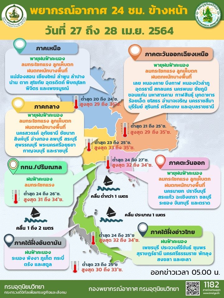 วันที่ 27 เมษายน กรมอุตุนิยมวิทยา พยากรณ์อากาศ 24 ชั่วโมงข้างหน้า บริเวณความกดอากาศสูงระลอกใหม่จากประเทศจีนได้แผ่ลงมาปกคลุมภาคตะวันออกเฉียงเหนือตอนบนของประเทศไทยและทะเลจีนใต้แล้ว ในขณะที่ประเทศไทยตอนบนมีอากาศร้อน ประกอบกับมีลมตะวันตกเฉียงใต้และลมตะวันออกเฉียงใต้พัดปกคลุมประเทศไทย ลักษณะเช่นนี้ทำให้ภาคเหนือ ภาคตะวันออกเฉียงเหนือ ภาคกลาง และภาคตะวันออก มีพายุฤดูร้อนเกิดขึ้น โดยมีลักษณะของพายุฝนฟ้าคะนอง ลมกระโชกแรง ลูกเห็บตก และอาจมีฟ้าผ่าเกิดขึ้นได้ โดยมีฝนตกหนักบางแห่ง