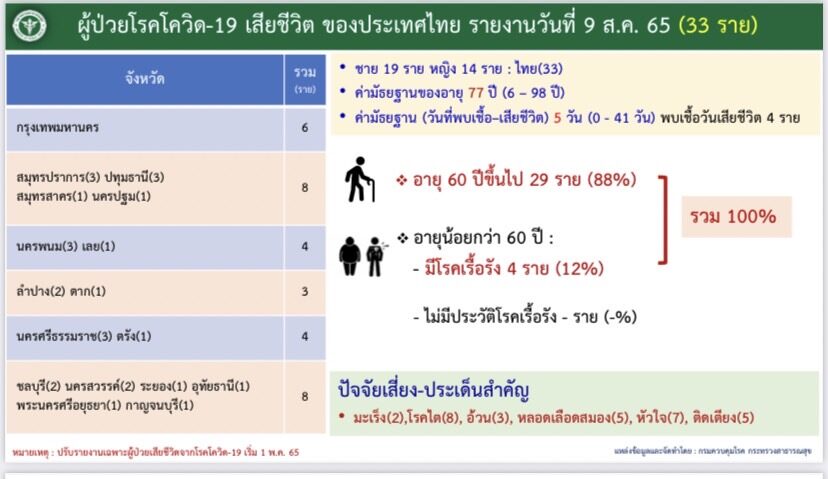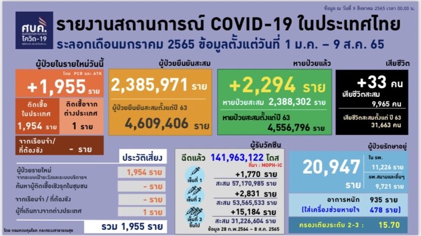 สำหรับประเทศไทย วันนี้พบผู้ติดเชื้อรายใหม่ 1,955 ราย ติดเชื้อในประเทศ 1,954 ราย ผู้ติดเชื้อจากต่างประเทศ 1 ราย และไม่มีผู้ติดเชื้อจากเรือนจำและที่ต้องขัง เป็นผู้ป่วยยืนยันสะสมตั้งแต่ปี 2563 จำนวน 4,609,406 ราย หายป่วย 2,294 ราย โดยผู้หายป่วยสะสมตั้งแต่ปี 2563 จำนวน 4,556,796 ราย เสียชีวิต 33 ราย โดยเสียชีวิตสะสมตั้งแต่ปี 2563 จำนวน 31,663 ราย ผู้ป่วยรักษาอยู่ 20,947 ราย แบ่งเป็น อยู่ในโรงพยาบาล 11,226 ราย และโรงพยาบาลสนามอื่นๆ 9,721 ราย มีอาการหนัก 935 ราย และใส่เครื่องช่วยหายใจ 478 ราย ติดเชื้อนอกโรงพยาบาล (ATK) (สัปดาห์ที่ 31 : 31 ก.ค.-6 ส.ค.2565) จำนวน 235,753 ราย สะสม 7,105,849 ราย