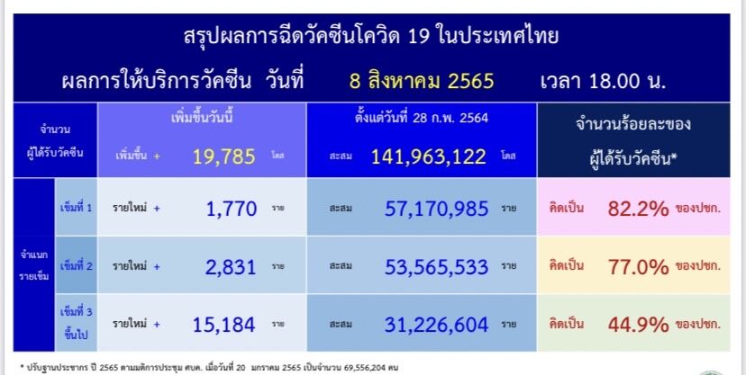 รายงานศบค. ระบุว่า จำนวนผู้ได้รับวัคซีน เมื่อวันที่ 8 สิงหาคม ที่ผ่านมามีผู้ได้รับวัคซีนรวม 19,785ราย สะสมตั้งแต่วันที่ 28 กุมภาพันธ์ 2564 จำนวน 141,963,122 โดส แบ่งเป็นเข็มที่หนึ่งเพิ่มขึ้น 1,770 ราย สะสม 57,170,985 ราย คิดเป็น 82.2% ของจำนวนประชากร เข็มที่สองเพิ่มขึ้น 2,831 ราย สะสม 53,565,533 ราย คิดเป็น 77.0% ของจำนวนประชากร เข็มที่สามเพิ่มขึ้น 15,184 ราย สะสม 31,226,604 ราย คิดเป็น 44.9% ของจำนวนประชากร