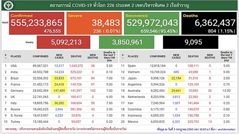 เมื่อวันที่ 5 กรกฎาคม ผู้สื่อข่าวรายงานว่า ศูนย์บริหารสถานการณ์การแพร่ระบาดของโรคติดเชื้อไวรัสโคโรนา 2019 (โควิด-19) (ศบค.) รายงานสถานการณ์การติดเชื้อโควิด-19 ทั่วโลก พบว่า มีผู้ติดเชื้อโควิด-19 ทั่วโลกสะสม จำนวน 555,233,865 ราย รักษาหายแล้ว รวม 529,972,043 ราย และเสียชีวิต รวม 6,362,437 ราย โดยประเทศที่มีจำนวนผู้ติดเชื้อสูงที่สุด 5 อันดับ ได้แก่ สหรัฐอเมริกา อินเดีย บราซิล ฝรั่งเศส และเยอรมัน ส่วนประเทศ ไทย อยู่ใน อันดับที่ 26 ของโลก