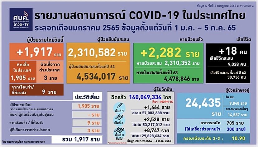 โควิดติดเชื้อเพิ่ม 1,917 ราย จากต่างประเทศ 3 ราย เสียชีวิต 18 ราย ไทยติดเชื้ออันดับ 26 ของโลก ฉีดเข็มสามเพิ่มขึ้น 42.9%