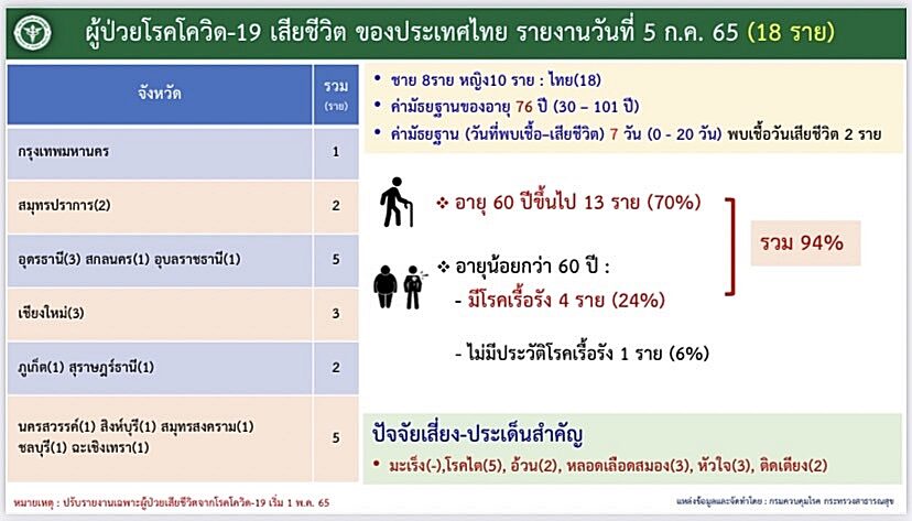 รายงาน ศบค.ระบุต่อว่า ผู้เสียชีวิต จำนวน 18 ราย อยู่ในกรุงเทพมหานคร 1 ราย สมุทรปราการ 2 ราย อุดรธานี 3 ราย สกลนคร 1 ราย อุบลราชธานี 1 ราย เชียงใหม่ 3 ราย ภูเก็ต 1 ราย สุราษฎร์ธานี 1 ราย นครสวรรค์ 1 ราย สิงห์บุรี 1 ราย สมุทรสงคราม 1 ราย ชลบุรี 1 ราย และฉะเชิงเทรา 1 ราย จำแนกเป็น เพศชาย 8 ราย และเพศหญิง 10 ราย แบ่งเป็น อายุ 60 ปีขึ้นไป 13 ราย ต่ำกว่า 60 ปีมีโรคเรื้อรัง 4 ราย ไม่มีประวัติโรคเรื้อรัง 1 ราย
