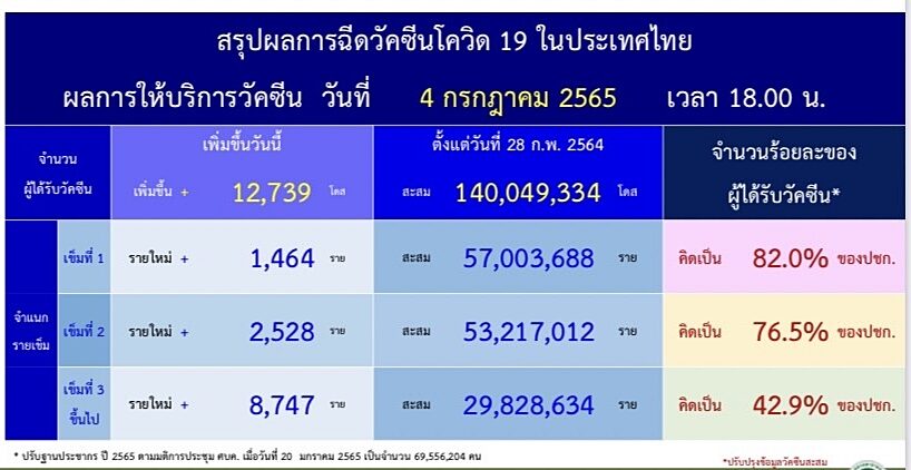 รายงาน ศบค.ระบุว่า จำนวนผู้ได้รับวัคซีน เมื่อวันที่ 4 กรกฎาคมที่ผ่านมา มีผู้ได้รับวัคซีน รวม 12,739 ราย สะสมตั้งแต่วันที่ 28 กุมภาพันธ์ 2564 จำนวน 140,049,334 โดส แบ่งเป็น เข็มที่หนึ่งเพิ่มขึ้น 1,464 ราย สะสม 57,003,688 ราย คิดเป็น 82.0% ของจำนวนประชากร เข็มที่สองเพิ่มขึ้น 2,528 ราย สะสม 53,217,012 ราย คิดเป็น 76.5% ของจำนวนประชากร เข็มที่สามเพิ่มขึ้น 8,747 ราย สะสม 29,828,634 ราย คิดเป็น 42.9% ของจำนวนประชากร