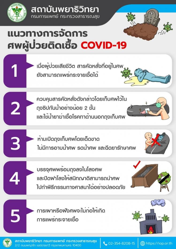 ทั้งนี้ทางสถาบันพยาธิวิทยา กรมการแพทย์ กระทรวงสาธารณสุข ได้มีแนวทางวิธีการจัดการการศพผู้เสียชีวิต กรณีผู้ป่วยโควิด-19 เสียชีวิต เพื่อการจัดการเชื้อ โดยระบุว่า